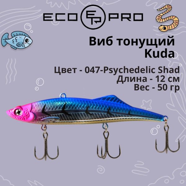 × Виб (тонущий воблер) для зимней рыбалки ECOPRO Kuda 120мм 50г 047-Psychedelic Shad на судака, щуку, окуня. 761,00