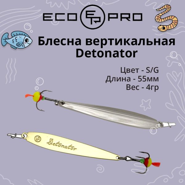 Хорошая поисковая блесна, собирающая рыбу с большого расстояния и обладающая ярко выраженной игрой. Приманка ECOPRO Detonator планирует из стороны в сторону, отклоняясь от вертикальной оси и переваливаясь с боку на бок. В конструкции приманки заложена возможность устанавливать крючок на оба конца блесны. После переустановки крючка приманка при падении начинает активнее «рыскать» из стороны в сторону.