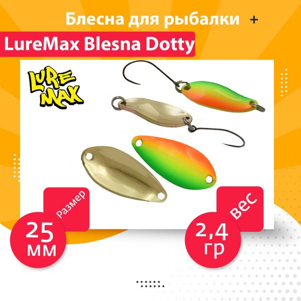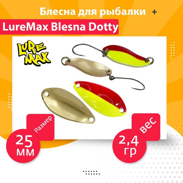 Luremax Dotty – небольшая приманка весом 2,4г. Благодаря своим компактным размерам помимо ловли традиционных хищников (форели, окуня, головля) подходит для ловли «белой» рыбы — язя, красноперки и т.д. Блесна имеет очень хорошую активную игру и не сбивается даже на самой активной проводке. Так же не смотря на малый вес у данной колебалки очень хорошие “полетные” качества.