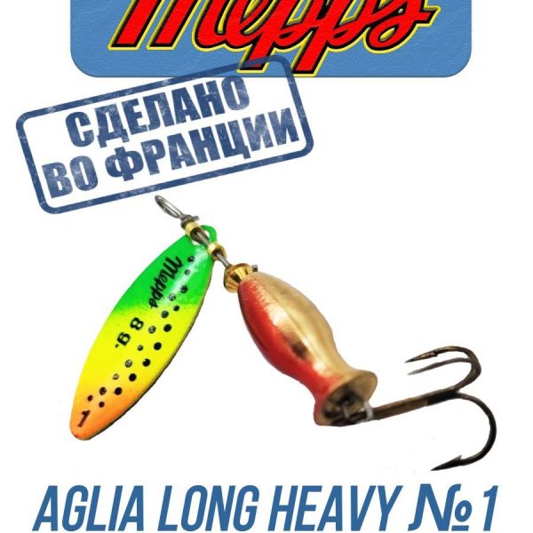 Благодаря пулеобразному тяжелому сердечнику возможен максимально дальний заброс Aglia Long Heavy. При вращении угол отклонения лепестка от оси составляет 30°. Рекомендуются для плотных потоков, быстрой и глубокой воды, а также для ловли против течения. Хороша и для использования в озерах при охоте на донных хищников, которые не реагируют на быстроходные приманки.