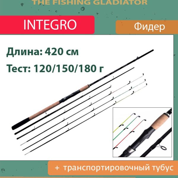 Фидер Integro представляет собой серию бюджетных фидерных удилищ c современным и эффектным внешним видом, при невысокой стоимости серия способна удовлетворить самых требовательных рыболовов. Integro имеет очень широкую размерно-тестовую линейку — от 240 до 420 см от 10 до 180 г, которая позволяет подобрать оптимальное удилище для любых условий, подойдет как для стоячей воды и использования легких кормушек, так и для водоемов с сильным течением и самых тяжелых весов. Фидер изготовлен из комбинации материалов — усиленный комель выполнен из графита IMF, верхние колена — из высокомодульного графита, что делает удилище очень прочным с правильным распределением нагрузки при забросе, обеспечивающим отличную посылистость и необходимую жесткость. Фидер оснащен современным катушкодержателем, рукоять выполнена из комбинации пробки и EVA, пропускные кольца SIC, в комплекте идут три взаимозаменяемые вершинки различной жесткости.