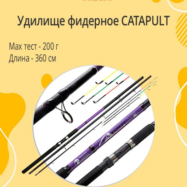 CATAPULT – линейка штекерных удилищ для ловли на английскую донку, или известную многим фидерную оснастку с кормушкой, представлена в трех наиболее популярных длинах 3,30м, 3,60м, 3,90м, и в трех тестах до 120гр, 150гр и 200гр. Материал изготовления – это композит с содержанием графита 24Т не менее 30%. Это так называемые «тяжелые» удилища для дальнего заброса кормушек большого веса. Удилища CATAPULT отлично подойдут для ловли карпа, леща и многих других видов мирной рыбы не только в озерах и заливах, но и в реках с сильным течением. Мощные и чуткие, они не только с легкостью доставят кормушки и насадки на большие расстояния, но и мгновенно просигнализируют Вам даже о самой деликатной поклевке. Вываживание рыбы на CATAPULT вызывает только положительные эмоции. Необременительная цена является одним из неоспоримых достоинств этой серии.