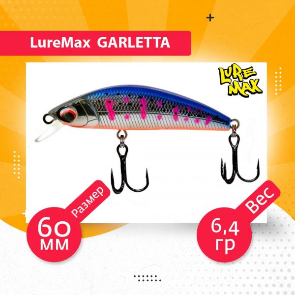 LureMax Garletta — это небольшой тонущий воблер с высокой изогнутой спинкой и тонким корпусом. Отличная приманка для многих видов рыб, таких как форель, окунь, щука, голавль и судак. За счет оптимального сочетания веса и формы достигается большая точность заброса.