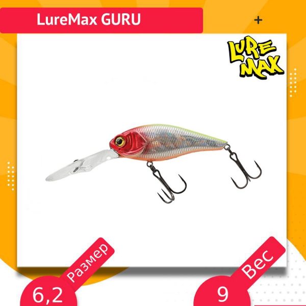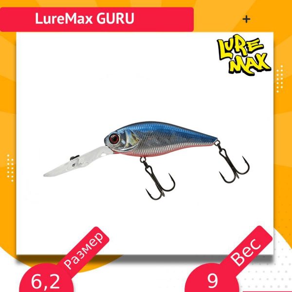 Приманка классической формы в стиле , благодаря широкому телу создаёт мощные колебания, привлекая хищную рыбу на большом расстоянии. Благодаря нейтральной плавучести на паузе в проводке Luremax Guru не опускается на дно, и не выныривает на поверхность. Основные способы анимации – равномерная проводка, проводка с остановками, а так же неагрессивный твитчинг. Подходит для средних глубин как при ловле в заброс, так и для троллинга.