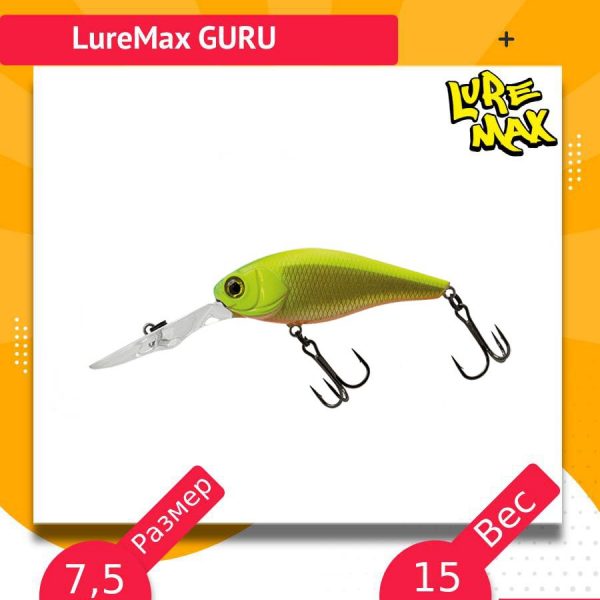 Приманка классической формы в стиле , благодаря широкому телу создаёт мощные колебания, привлекая хищную рыбу на большом расстоянии. Благодаря нейтральной плавучести на паузе в проводке Luremax Guru не опускается на дно, и не выныривает на поверхность. Основные способы анимации – равномерная проводка, проводка с остановками, а так же неагрессивный твитчинг. Подходит для средних глубин как при ловле в заброс, так и для троллинга.
