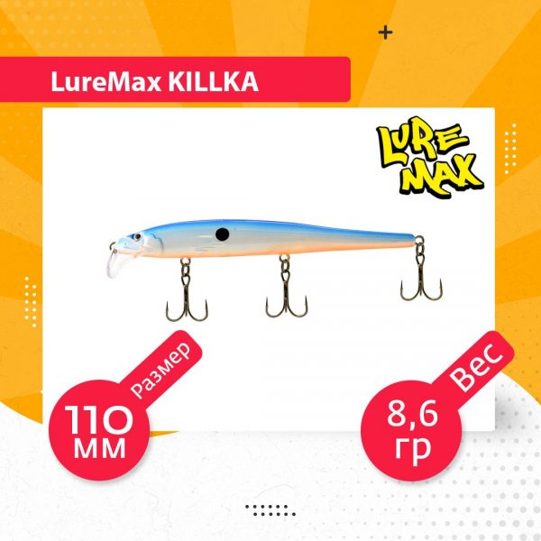 Воблер Killka с седловидной лопаткой создан специально для троллинговой ловли. У Killka высокочастотная игра с небольшой амплитудой и «отскоками» в стороны провоцирует на поклевку судака, кумжу, лосося и других хищников. Воблер стабильно играет на самых разных скоростях проводки, что позволяет подобрать правильную подачу приманки в различных условиях при разной температуре воды.