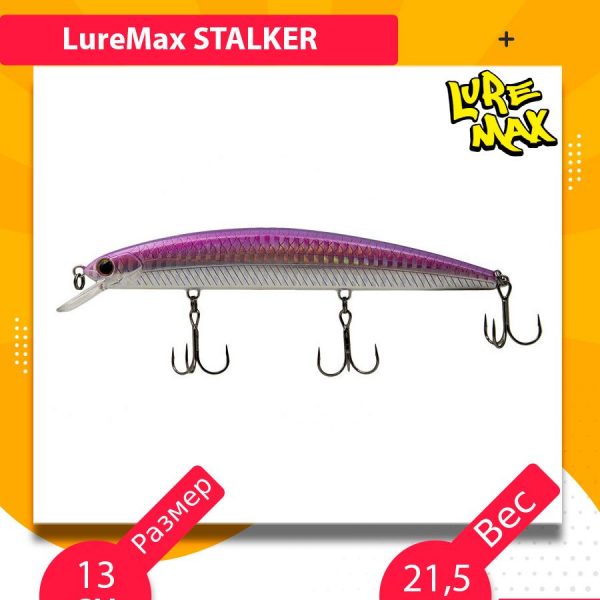 Воблер относится к приманкам класса Big Minnow. Оснащен магнитной системой дальнего заброса с перемещающимся центром тяжести. Это позволяет делать точные забросы на дальние расстояния даже при сильном порывистом ветре. После погружения в воду приманка занимает вертикальное положение головой вверх, напоминая кормящуюся рыбку. Модель предназначена для проводок в стиле твичинг. На рывках Stalker имеет широкую игру «елочкой» с покачиванием боками и зависанием на паузах. Помимо твичинга, воблер обладает привлекательной собственной игрой на равномерной проводке. Отлично подходит для ловли средней и крупной щуки.Приманка оснащена крючками Saikyo Япония.